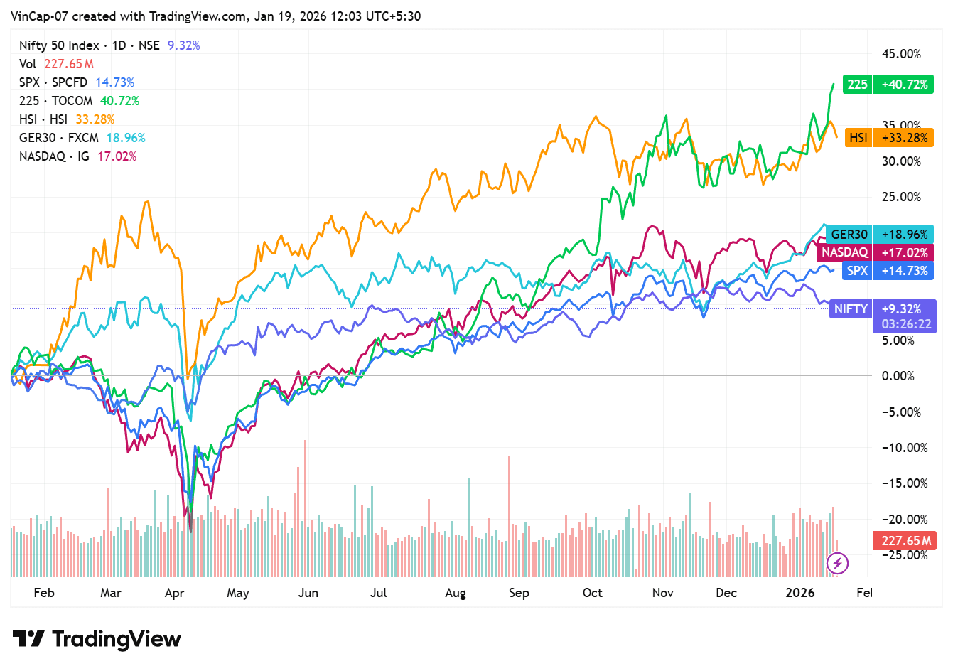 Major global indices like Nasdaq-S&P 500 (US), Hang Seng, DAX (Germany) and Nikkie 225 (Japan) have sizably outperformed the Nifty 50 in 2025, as seen below: