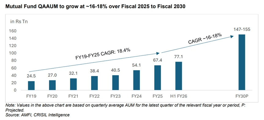 Over the last decade, mutual funds in India have grown at a rapid pace, with AUM compounding at ~18% annually between FY19 and FY25. CRISIL Intelligence expects this growth momentum to continue through 2030, potentially taking industry AUM beyond ₹150 lakh crores.