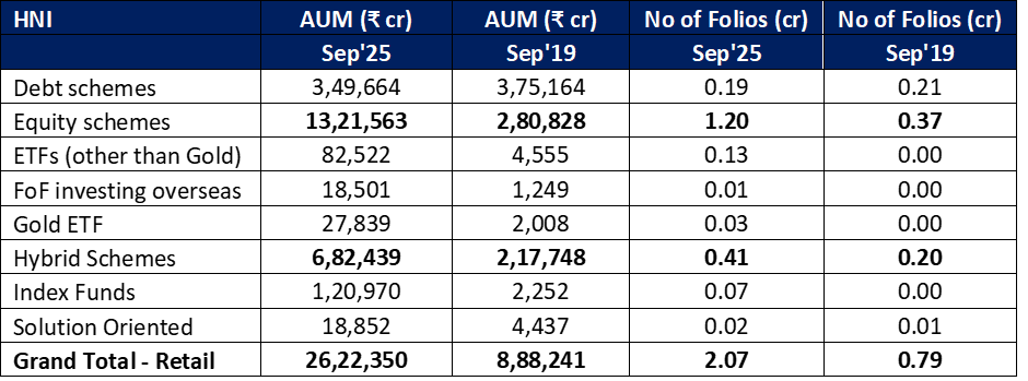 Retail AUM has grown nearly 4 times from ₹5.2 lakh crores in Sep'19 to ₹20.8 lakh crore in Sep'25. HNI* AUM, on the other hand, has grown around 3 times from ₹8.9 lakh crore to ₹26.2 lakh crore.